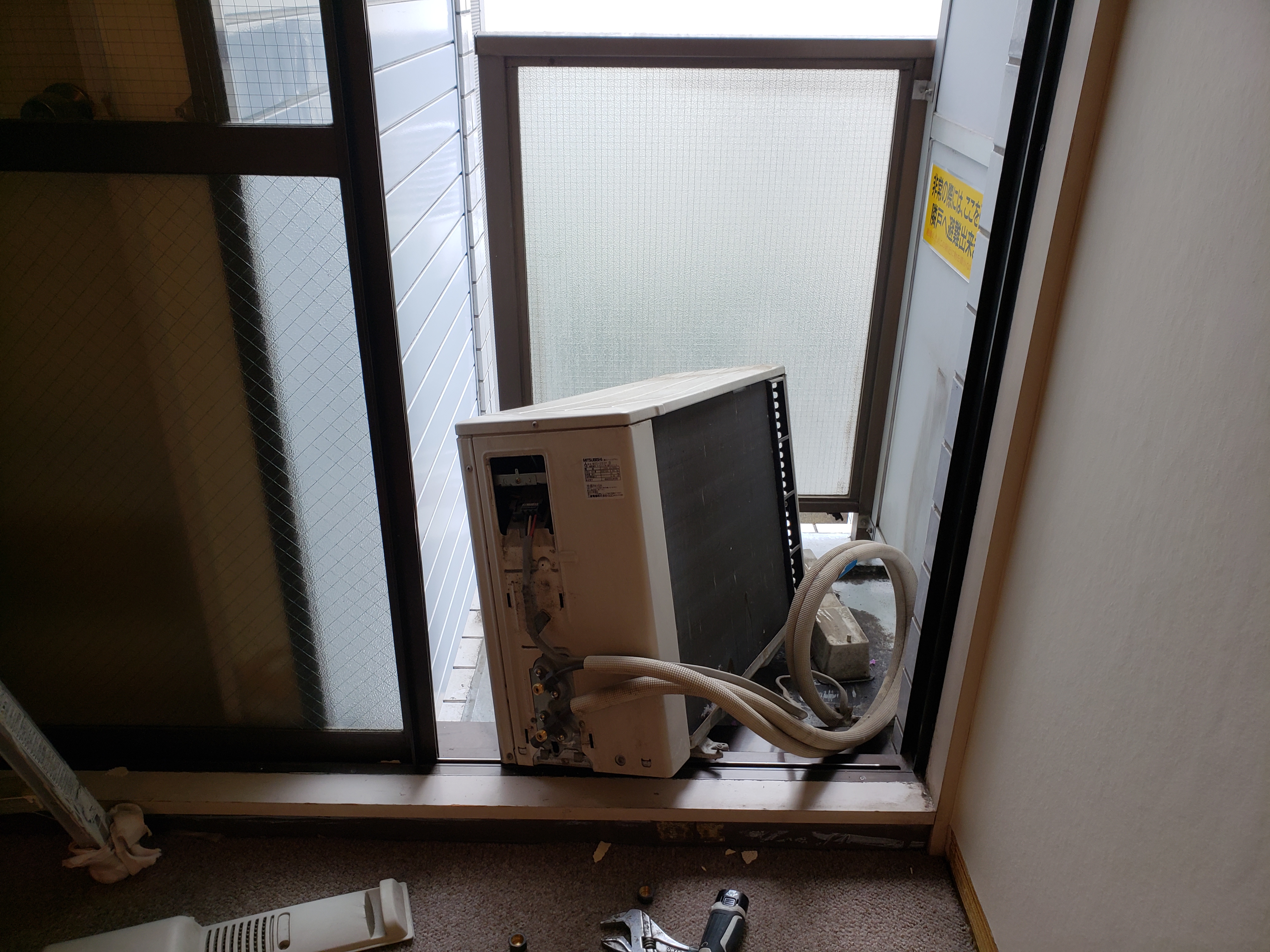 向きを変えたところ、長い配管をぐるぐる回して室外機の熱交換器背面とお隣の部屋非常パネル間仕切りの隙間においてあり、狭いところをもっと狭く、災害時には間仕切りを破って