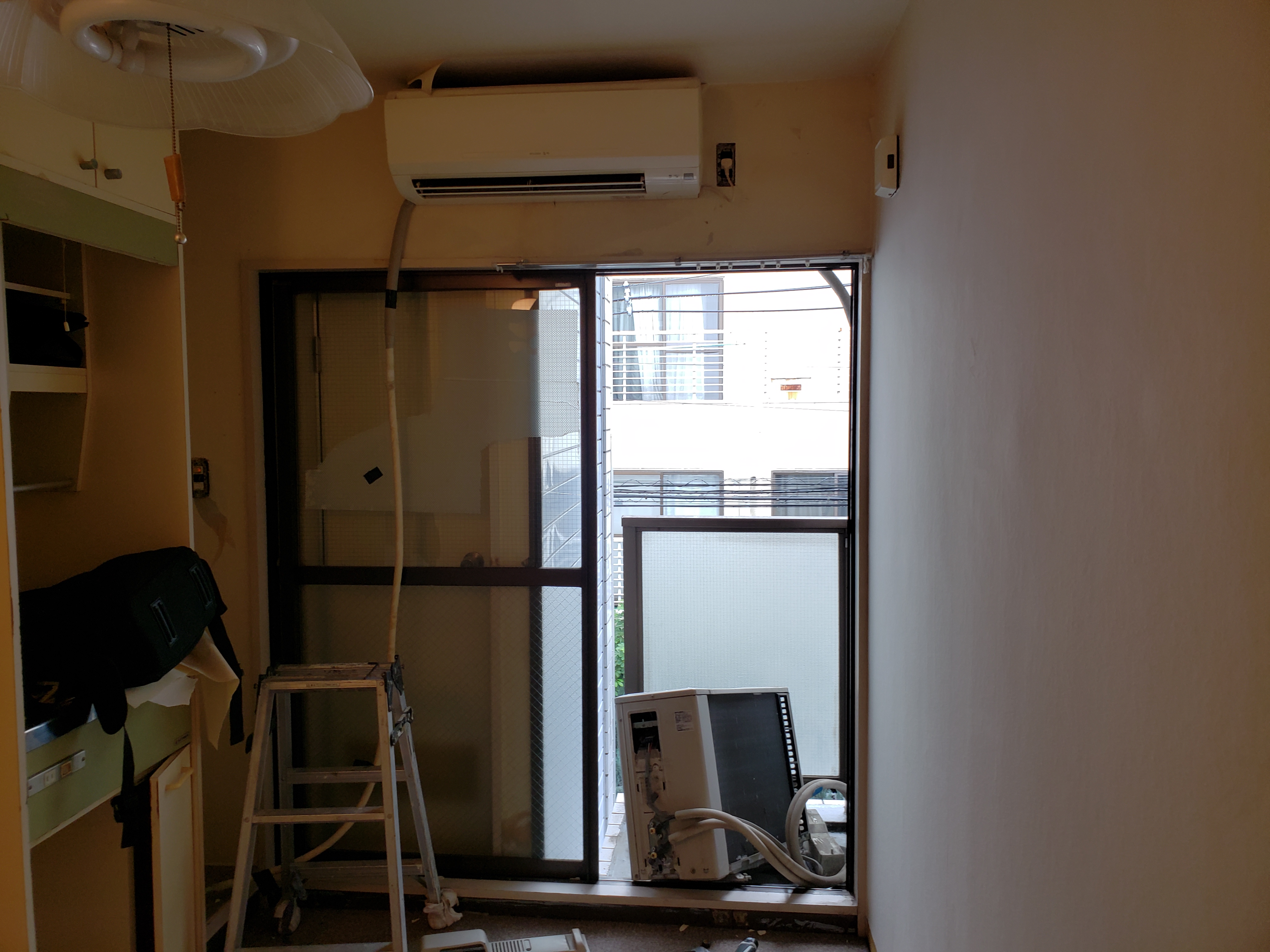 ↓室内機から垂らされているドレン管もバルコニー側に出す予定です。