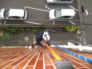 今回の現場は近くに駅周辺の線路があるため、電気柱と電気線が建物の周辺を囲んでいるようなとこでしたので、バケット車が使えない難しい現場でした。