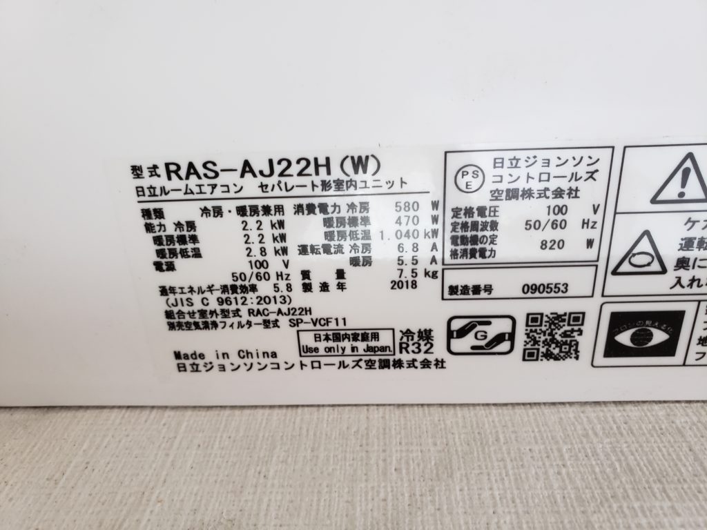 取り付けた機種は日立さんの6畳(冷房)RAS-AJ22H W 日立 白くまくんをエアコンです。